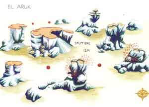 zum Vergrößern bitte klicken Ort Nördlich von Gota Abu Ramada (zwischen 45 und 75 Minuten von Hurghada) steht eine größere Anzahl an Ergs. Sie erstrecken von Südwesten nach Nordosten und werden in drei Tauchgebiete aufgeteilt: Aruk Diana (Südwesten), Aruk Giftun (Mitte) und Aruk Gigi (Nordosten). Die Illustration zeigt Aruk Diana. Meeresbedingungen Zeit sind allerdings starke Strömungen vorhanden. Tauchplan Egal welchen Weg Sie einschlagen, passen Sie auf, dass sie sich nicht verirren. Wenn Sie über einen schlechten Orientierungssinn verfügen, wählen Sie einen zentralen Erg im Gebiet aus, und verwenden Sie ihn jedes Mal als Referenz, wen Sie von einem Erg zum anderen schwimmen. Die meisten Taucher halten sich in Grundnähe um die Ergs auf. Scheuen Sie sich nicht flach zu tauchen, das Leben und die Farben sich ausgesprochen schön. Aruk Diana setzt sich aus 7 Ergs zusammen (6 sind abgebildet), wo sich im Zentrum ein gespaltener Erg befindet. Aruk Giftun ist eine Gruppe von 7 Ergs auf einem steinigen Meeresgrund. Einer der kleineren hat eine Grotte, die voll mit Glasfischen, Rotfeuerfischen und Drachenköpfen ist. Aruk Gigi setzt sich aus 11 Ergs zusammen, die in einer Linie eng zusammen liegen, sodass man von einem zum anderen sehen kann. Unterwasserleben Hier findet man die üblichen Papageifische, Drückerfischer und Kaninchenfische, und jede Menge Blaupunktrochen, Meerbarben, Steinfische, Drachenköpfe, Filament Teufelsrochen, Schneeflockenmuränen, Graue Muränen und viele andere mehr.