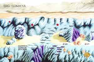 zum Vergrößern bitte klicken Ort Etwa 75 Minuten außerhalb von Hurghada an der Ostseite von Giftun Soraya liegt Erg Somaya. Zum Süden hin befindet sich der Turm der Giftun Polizei Station und zum Norden ein kleiner Gebirgskamm. Das Riff fällt schnell auf einen sandigen Sims zwischen 15 und 24m ab, darüberhinaus auf 50m. Auf den Sims stehen 2 Türme. Einer zwischen 18 und 10m hat eine Bojenleine. Im Norden zwischen 20 und 12m befindet sich ein weiterer, geformt wie eine Pyramide und übersät mit purpurroten Weichkorallen. Unter dem Sims zwischen den 2 Ergs gibt es 2 Höhlen bei 25 und 32m, die sich zu einem Kamin vereinigen.