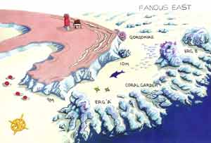 zum Vergrößern bitte klicken Ort Dieses Riff hat mehrere Namen. Torfa el Fanous, Dolphin Reef oder Dolphin´s Playground. Was auch immer für einen Namen Sie benutzen, es ist ein schmales Riffband um eine große Lagune herum im Nordwesten von Giftun Kebir. An seiner Ostseite teilt ein Kanal das Riff vom Festland ab und es fällt gemächlich zu einem Korallengarten mit 3 farbenfrohe Türmen ab. Es dauert etwa 45 Minuten bis 1 Stunde um dorthin zu gelangen. Meeresbedingungen In der Lagune ist es immer ruhig, die Nordseite dagegen ist dem Wetter ausgesetzt. Die Strömung teilt sich auf der Nordseite und verläuft nach Osten und Westen entlang des Riffes, sodass man beim Leuchtfeuer seinen Tauchgang beginnen und sich durch den Kanal zurücktreiben lassen kann. Tauchplan Schwimmen Sie 15m nach außen zu Erg „A“ ( Abbildung ), dem Korallengarten und Erg “B“. Schließen Sie die Fächerkorallen an der Ecke in ihrem Plan mit ein, bevor Sie zurück kehren. Unterwasserleben Es ist nicht ungewöhnlich hier eine Schule mit 5 oder 6 Delphinen während dem Tauchen zu sehen. Schildkröten, Blaupunktrochen, Adlerrochen, Makrelen und Barrakudas geben sich ein Stelldichein. Faszinierend an dieser Tauchstelle ist, dass man Raritäten wie Flügelrossfische im Sand, Angelfische auf dem Erg und einen seltenen Sternengucker sehen kann.
