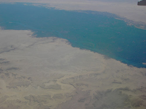 Richtung Hurghada überfliegt man ein Stück vom Niltal, wenn man Glück hat, entscheidet sich der Pilot auch für einen kurzen Rundflug über Kairo, und fliegt dann ein Stück direkt über den Nil.
