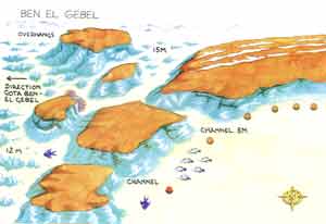 Ort Zwischen Giftun Soraya und Giftun Kebir liegt eine kleine Straße. Ein bogenförmiges Riff zieht sich an der Nordseite von Giftun Soraya entlang. dies ist Ben El Gebel (arabisch: zwischen den Bergen ). Das Riff wird auch Shaab Torfa genannt. Am Ende dieses Halbbogens liegen 5 Ergs. Dies ist ihre Tauchstelle. Sie befindet sich etwa 90Minuten von Hurghada entfernt.
