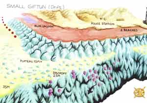 Tauchplan Ihre Einstiegsstelle variiert ja nachdem wie hoch Ihr Luftverbrauch ist und wie tief Sie tauchen möchten. Gegenüber der 2 Strände ist ein guter Ort oder auch gegenüber des Turms. Schwimmen Sie Richtung Süden mit dem Riff an Ihrer rechten Schulter. Mehrere Höhlen findet man bei 35m und ein Tunnel führt von 40 bist auf 45m herunter ( Achtung - Tiefenlimit ). Wo das Plateau beginnt, kann man weiter dem Steilabfall folgen, passen Sie nur auf, dass Sie sich nicht zu weit vom Riff entfernen, sonst haben Sie einen beschwerdlichen Rückweg.
