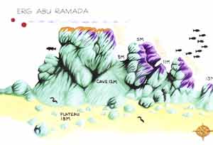 Tauchplan Verschwenden Sie keine Zeit zum Steilabfall zu gehen ( 30m nach Osten ). Es gibt bessere Tauchstellen dafür. Die Luft kann man viel besser bei der Umrundung der Ergs verbrauchen, indem man sich immer flacher arbeitet. Besuchen Sie die kleinen Höhlen auf der Ostseite des großen Ergs und an der Nordseite des mittleren Ergs. Die Nordseiten weisen einen außergewöhnlichen starken Bewuchs von purpurroten Weichkorallen auf. Je flacher Sie sind desto schöner. Ein perfekter Tauchgang für Fotografen.