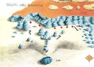 Ort 60-90 Minuten von Hurghada entfernt. Am Südende von Abu Ramada befinden sich südlich der Insel auf dem Riff eine sehr kleine Insel und 3 große Felsen. Die Tauchstelle ist das Riff südlich von hier. Östlich der Anlegestellen fällt eine Wand auf 35m ab. Einen längeren Weg entfernt befindet sich eine blasenförmige Kaverne mit mehrer Einstiegsstellen. Sie ist gefüllt mit einer großen Vielfalt von Weichkorallen, Beilbachfischen, Kardinalfischen und Soldatenfischen. Im Südwesten sind zahlreiche Türme mit reichlich Fischleben. Der Grund dagegen ist nackt und schaut einer Mondlandschaft ähnlich.