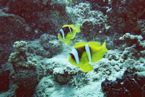 Riff. Die kleinen Fische halten sich zwischen den mit Nesselzellen bewehrten