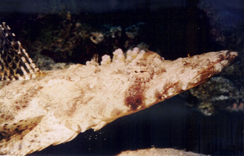 Der Krokodilfisch hat ein krokodilähnliches Aussehen und gehört zu den Knochenfischen. Sie sind Lauerräuber die meist halb eingegraben im Sand liegen. Er packt Fische, die bis zu einem Meter an sie herankommen, indem er blitzschnell vorschnellt. Die Augen sind von einem netzartigen Organ überdeckt, dass sich je nach Sonneneinstrahlung zusammenzieht oder ausdehnt. (Lidähnlicher Lichtschutz) Die Tiere können bis zu 1m groß werden und kommen höchstens bis auf 40m hinunter.