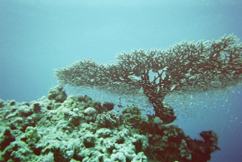 Tischkorallen findet man sehr häufig an Ergs und können sehr groß werden. Sie bieten vielen Fischen unterschlupf. Wenn es keine kleinen Fischschwärme sind, sind es oft auch große Schwarzpunkt Süsslipper.