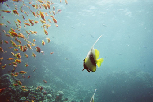 sieht man ihn am Spätnachmittag paarweise im Riff. Wimpelfische werden