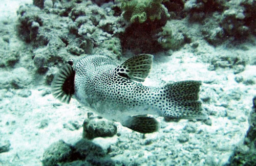 Der Schwarzfleckkugelfisch ist sehr häufig zu sehen, doch hat er wohl eine Phobie gegen Fotoaparate. Die äußerst schönen Tiere sind leider sehr scheu und flüchten bei jeder kleinen Handbewegung. Bei Gefahr können sich die Tiere zu einer Kugel aufblasen. Doch sollte man sie nicht absichtlich reizen, da sie sich nur ca. 10mal in ihrem Leben aufblasen können, dann stirbt das Tier!