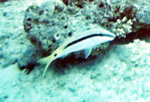 Diese Barbe wird bis 28cm groß und lebt in einer Tiefe von 3-30m. Das typische Merkmal des überwiegend weißen Fisches, ist der quergezogene schwarze Strich dem Körper entlang und färbt sich zur Schwanspitze hin gelb, wo die Männchen noch einen schwarzen Punkt aufweisen, den man hier am Foto gut erkennen kann. Die Tiere kommen oft in Gruppen den Riffen entlang, sind aber auch in Lagunen oft einzeln zu sehen.