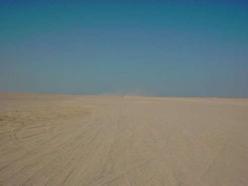 Klein im Hintergrund kann man die Jeeps erkennen, die in der scheinbar ewigen Sandlandschaft auf einem zukommen. Die Jeeps fahren nie alleine durch die Wüste, da man hier leicht die Orientierung verlieren kann. Wenn ein Jeep verloren geht, bedeutet das für denjenigen einfach stehen bleiben und warten, bis jemand kommt. Denn wenn man selbst den richtigen Weg wieder finden will, kann es vorkommen das man sich noch mehr verirrt. Diese Methode praktizieren die Jeep-Chauffeure, da es oft vorkommt das einer verloren geht, vor allem bei den Heimreisen im Dunkeln, da teilweise die Scheinwerfer ausgeschalten werden, um die klare Sternennacht beobachten zu können.