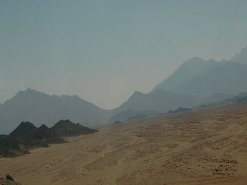 Kurz nach Sonnenuntergang in der Wüste zwischen den Bergen. Durch die Luftdichte scheinen sich die Berge wieder zu spiegeln... ein sehr ausdrucksvoller Anblick.