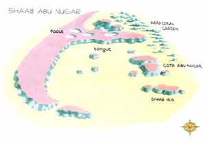 zum Vergrößern bitte klicken Ort Etwas 60-90 Minuten nördlich von Hurghada setzt sich Shaab Abu Nugar aus einem T-förmigen Riff im Westen und einem flachen Plateau mit vielen Ergs im Osten zusammen. Getaucht wird an den süd-östlichen Ergs (Shaab Iris), an den 2 großen mittleren Ergs (Gota Abu Nugar), oder an der Nordseite der Zunge, die vom Hauptriff nach Westen zeigt. Der Name Abu Nugar bedeutet wörtlich übersetzt " Vater der Teiche" als Anspielung auf mehrer klare Lagunen im Riffdach.