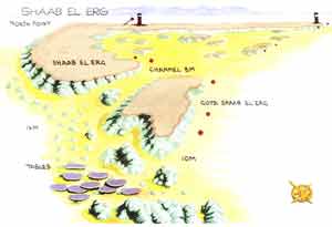 zum Vergrößern bitte klicken Ort 90 Minuten bis 2 Stunden nördlich von Hurghada. Shaab El Erg ist ein ausgedehntes Riff in hufeisenform mit der offenen Seite nach Süden. In der Mitte des Hufeisens befindet sich eine schöne Lagune, welche mit Ergs überseht ist. Getaucht wird an verschiedenen Plätzen, an der nördlichen Spitze, der westlichen Wand oder der süd- westlichen Spitze, bekannt als Gota Shaab el Erg.Der letztere ist der beliebteste Platz. Ein kleiner Kanal verläuft zwischen dem großem Erg und dem Hauptriff, an der Süd- und Westseite ist ein großes sandiges Plateau mit unzähligen Türmchen und Korallenköpfen.