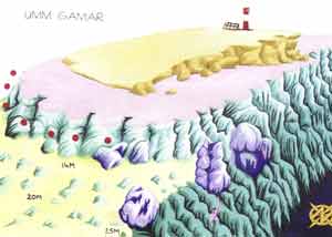 Ort Umm Gamar ist ein schmales, langgezogenes Riff in Nord-Süd Richtung 90 Minuten von Hurghada. Im Norden und Süden befinden sich schmale Plateaus im 20m Bereich. An der Ostseite fällt eine vertikale Wand bis in die stillen Tiefen hinab. Getaucht wird meist am Südplateau (nahe den Bojen) und an der Ostwand. Umm Gamar bedeutet „Mutter des Mondes“ – wahrscheinlich eine Anspielung auf die mondförmige Insel über dem Riff. Meeresbedingungen Gamar guten Schutz. Strömungen sind normalerweise kein Problem. Wenn eine vorhanden ist, werden Sie diese an der südöstlichen Ecke vorfinden Tauchplan Erster und zweiter (größerer) Korallenturm sind hohl, rund und mit Glasfischen gefüllt. Der Dritte hat eine große, sandige Höhle auf 27m. Alle drei sind mit purpurroten Weichkorallen und einer Wolke aus Glasfischen reichlich dekoriert. Unterwasserleben Fledermausfische und Wimpelfischschulen. Weißspitzenriffhaie kreuzen von Zeit zu Zeit bei. Im Februar/März schauen manchmal Mantas vorbei und im September bewachen die Riesendrücker ihre Nester. Bei den Korallentürmen kann man die natürlichen Feinde der Glasfische - Steinfische, Drachenköpfe und Rotfeuerfische – beobachten.